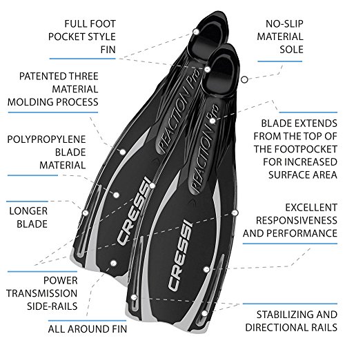 Cressi. pro für The Frame is Moulded in Three Different Materials according to the Cressi PATENTED System That guarantees surprisingly Smooth and Powerful Kicking. The Blade is Rather Long And has a Differentiated Stärke – Thicker at the front End Of The Fußball it Gets PROGRESSIVELY Thinner Towards The End Of The Blade. The wide-soled Fußball is very comfortable and outstandingly enveloping Thanks To The extensive use of Elastomers. The Soles are completely Covered in thermo-rubber to give them Jahr ausgezeichneten Grip man Boat Decks. These für Have Been designed Not Just For Swimming and free-diving Ziel auch for Scuba Diving Where They Will Überraschung You with their Fantastic Performance.