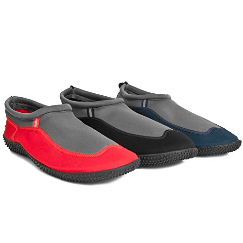 Herren Wasserschuhe Die Wasserschuhe sind bequem, robust und rutschfest und eigenen sich für ein breites Spektrum von Aktivitäten, wie beispielsweise Baden, Surfen, Segeln, Kanu fahren oder auch für einen Spaziergang am Strand. Die Schuhe sind sehr atmungsaktiv und dank Schnellverschluss schnell an- und ausgezogen. Der einstellbare Beinabschluss verhindert das Eindringen von Steinchen oder sonstigen spitzen Dinge. Nach Gebrauch kann die Sohle entnommen werden wodurch die Schuhe schneller trocknen. Produktvorteile: – robuste und rutschfeste Noppen-Gummisohle – einstellbarer Beinabschluss – Schnellverschluss zum schnellen an- und ausziehen – sehr atmungsaktiv durch Netzeinsatz – herausnehmbare Sohle – trocknen äußerst schnell Technische Daten: – Material: Neopren / Mesh – Material Sohle: TPR-Sohle (Gummi) – Größe: 42 – 46 – Farbe: Rot, Blau, Schwarz Lieferumfang: – 1x Wasserschuhe in gewählter Größe und Farbe