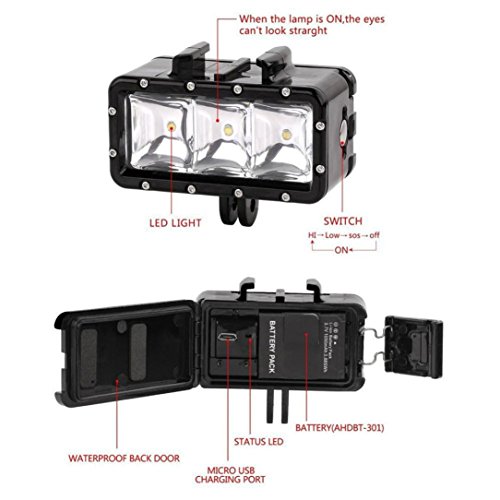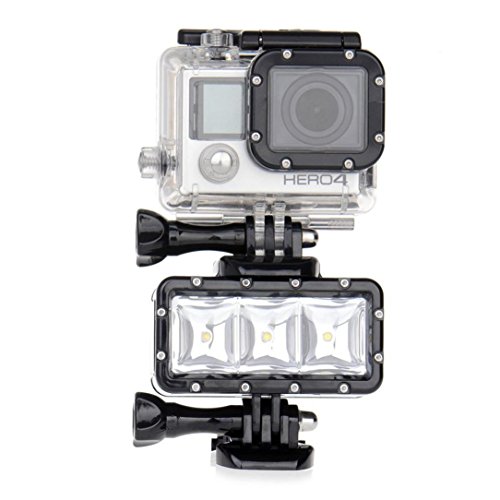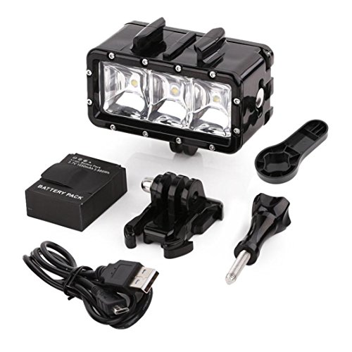 Ob unter Wasser, an Land oder in einem schlecht beleuchteten Raum befinden, kann die LED-Videoleuchte genügend Aufhelllicht für Ihre Action-Kamera bereitzustellen. Es kann Ihnen helfen, tolle Bilder auch in der 30-Meter unter Wasser oder anderen rayless Umfeld mit seinen 3 LEDs zu nehmen. Technische Daten: Material: ABS Farbe: Schwarz Laufzeit: Hohe / 1,5 Stunden; Low / 4 Stunden; SOS / 6 Stunden Kompatibilität: Für GoPro Hero 4 3 + 3 2 1, für SJCAM SJ4000 SJ5000 Action-Kameras, für Dazzne P2 Action-Kamera, für Xiaomi Yi Action-Kamera, etc. Batterie: 1050mAh Lithium-Ionen-Batterie (AHDBT-301) Wasserdicht: bis zu 30m / 98.4ft Paketliste: 1 x Wasserdicht Videoleuchte 1 x Akku 1 x Ladekabel 1 x Schnellverschluss Halterung 1 x Rändelschraube 1 x Schraubenschlüssel
