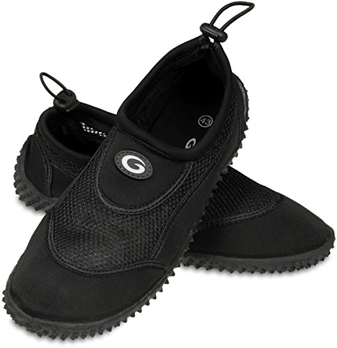Bequemer Aquaschuh für Herren von Gwinner ° Er bietet perfekten Schutz für die Füße am Strand oder im Wasser vor Steinen, Glas , scharfen oder spitzen Gegenständen ° Die Schuhe bieten einen leichten Einstieg und verfügen über einen Kordelzug. ° Das wasserdurchlässige Obermaterial aus Neopren ist zudem atmungsaktiv. ° Aquaschuhe bieten keinen 100% Schutz gegen Rutschen auf glatten nassen Oberflächen, wie z.b. im Schwimmbad. Dafür gibt es extra Slipper, Clogs oder Sandalen Strandschuhe mit anti-rutsch Sohlen. Material: Oberfläche Neopren, Sohle TPR