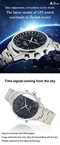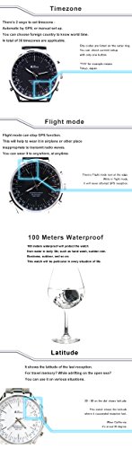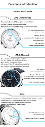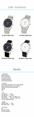 [Spezifikation] – Quarz -GPS Empfänger (Auto / Manuell) -Flugmodus (Stopp-Übertragung) -Zeitzone einstellen (30) -Breite (Wo Sie GPS-Signal empfangen) -100 Meter wasserdicht -Datum [Größe] – Gehäusedurchmesser: 45mm – Gehäuse Dicke: 14.5mm – Armbandlänge: 15 – 21 cm – Bandbreite: 22mm – Gewicht: Metall (170g) Leder( 90g) [Zubehör]- Originalverpackung- Bedienungsanleitung (Englisch)