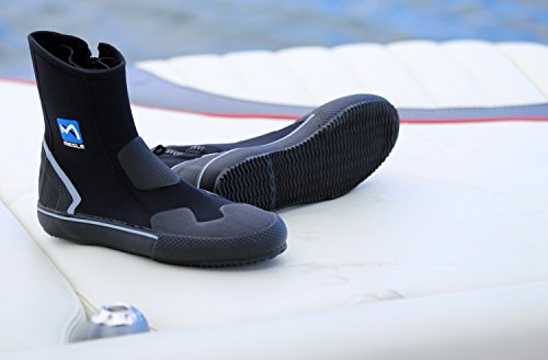 Die MESLE Neoprenstiefel mit rutschfester Gummisohle sind optimal geeignet in Verbindung mit Flossen offenes Fußteil). Windsurfen, Schnorcheln und Tauchen sowie Kajak und Boot fahren ist mit diesen Stiefeln kein Problem. Der Stiefel, ausgestattet mit einem praktischen Reißverschluss auf der Innenseite, besteht aus weichem, doppelt kaschiertem 5 mm Neopren. Dies garantiert Ihnen ein einfaches Ein- und Aussteigen sowie optimalen Tragekomfort. Durch den Reißverschluss mit Aquablock Neoprenabdeckung und die wasserdicht verklebten Nähte ist der Schuh beinahe komplett wasserdicht. Eine gummierte Rist-, Zehen- und Fersenkappe sorgt für reichlich Komfort und Abriebfestigkeit.