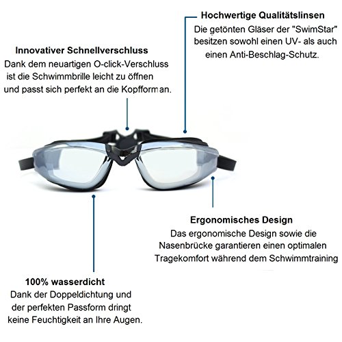 Undichte und beschlagene Schwimmbrillen sind jeden Tag ein Problem für begeisterte Freizeit- und Profi-Schwimmer. Mit der innovativen „SwimStar“ Premium Schwimmbrille -DAS ORIGINAL – lösen wir genau dieses Problem ein für alle Mal! In unserem Set erhalten Sie: 1 PREMIUM „SwimStar“ Schwimmbrille 1 hochwertige Schutzhülle 1 Paar Ohrstöpsel 1 Nasenklammer 3 Jahre Garantie Testsieger Qualität Wir von Sportastisch verwenden wir nicht nur modernste Materialien, sondern sorgen mit unserem innovativen „o-Click“ Verschluss oder dem V-Form Nasenbereich für eine optimale Funktionalität, die sich nicht mit konventionellen Schwimmbrillen vergleichen lässt. Ihre Vorteile: Ergonomisch geformte (extra weiche) Nasenbrücke Undurchlässige Doppeldichtung Innovativer O-Click-Verschluss Bruchsichere Gläser Be faster than a shark! Rechtliche Hinweise: Garantiebestimmungen und weitere Informationen zur Sportastisch Premium 3 Jahre Produktgarantie finden Sie unter garantie.sportastisch.com. Das Produkt wurde von experten-beraten.de (01/17) zum Testsieger gekürt.