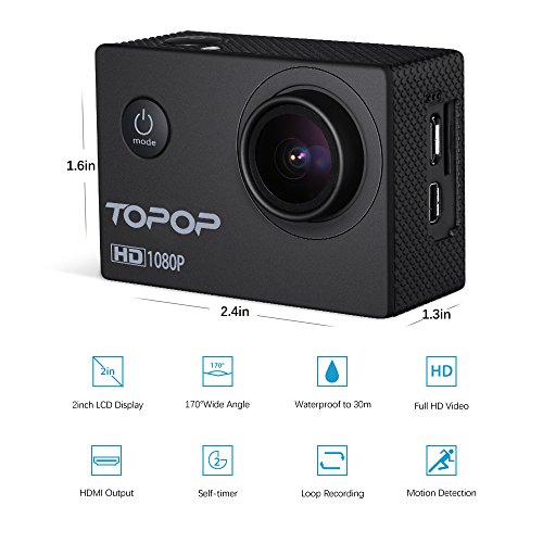 Diese Kamera ist speziell für Outdoor-Sportarten entwickelt undbietet 12MP Fotos und Full HD-Videos,Erfassen Sie jeden Moment erstaunlich! Mehrere ZubehörSport-Kamera x 1 Unterwassergehäuse x 1 Basis x 1 Schutztür (nicht wasserdicht ) x 1 Rücken Clamp x 1 Klebemontage x 2 Fahrradständer x 1 Basis x 1 Adapter x 1 Band x 4 Schalter Unterstützung x 3 Fixed Base x1 3M Klebstreifen x2 Bandage x2 Batterie x 1 Drahtseil x 1 Datenkabel x 1 Putztuch x 1 Benutzerhandbuch x 1Spezifikation: LCD-Display: 2.0LTPS Objektiv: 170-Grad-Fisheye-Objektiv Sprache: Deutsch / Englisch / Französisch / Spanisch / Italienisch / Portugiesisch / Traditionelles Chinesisch / Vereinfachtes Chinesisch / Japanisch / Russisch Video-Auflösung: 1080p (1920 * 1080) @ 30fps; 720p (1280 * 720) @ 30fps; 720p (1280 * 720) @ 60fps Video-Formate: MOV Video-Komprimierung Encoding: H.264 Bildauflösung : 12M (4032 x 3024); 10M (3648×2736); 8M (3264×2448); 5M (2592×1944); 3M (2048×1536); 2MHD (1920×1080); 1.3M (1280×960); VGA (640×480) Lagerung: Micro SDHC Klasse 6 oder höher. Unterstützung Lagerung 8G 32G. (Micro SD-Karte ist nicht im Lieferumfang enthalten) Capture-Modi: Single / 5s Timer / 10s Timer / 20s Timer Frequenz: 50Hz / 60Hz USB: Micro USB2.0 Stromversorgung : 5V / 1A Akku-Kapazität: 900mAh Leistungsaufnahme: 330mAh @ 4V Batterieberufsleben : 1080p / 90min Ladezeit : ca. 4 Stunden Unterstützungs-OS: Windows XP / 7/8 SP3 / Vista und Mac 10.5 oder höher Dimension: 59.27 * 41.13 * 29.88mm Hinweis: 1. Diese Kamera hat keine WiFi-Funktion. 2. Wir empfehlen Ihnen, mit einer höchstens Markenprodukt der Lagerung mindestens 8G und 32G der Klasse 6 oder Höher Micro-SD-Karte.